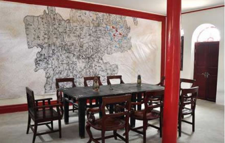遵義會議會址是在二樓東側的長方形,客廳面積27平方米,墻上掛著一臺時鐘,客廳中央有一褚色長方桌,周圍有一圈木架藤條折疊靠背椅。西墻是一排玻璃窗,可見遠處青山和臨街民房。
