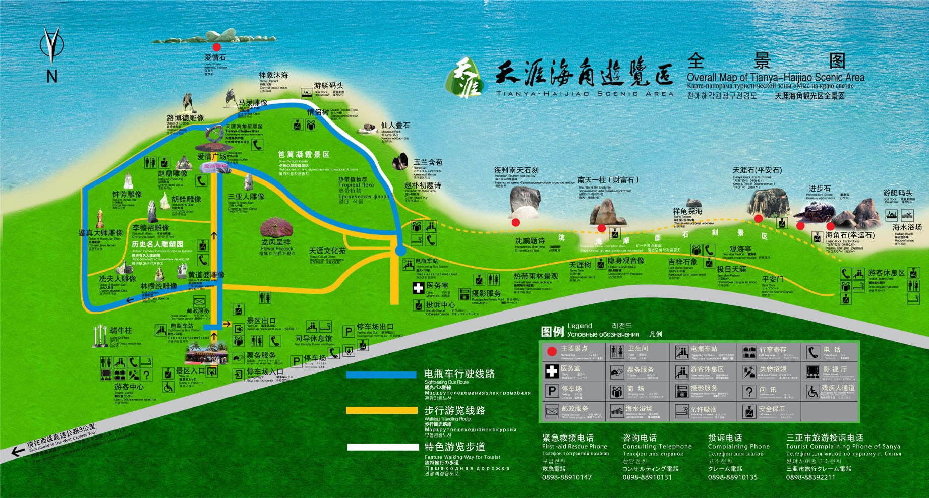 2、步行游覽線路:從大門口環(huán)繞歷史名人雕塑園游覽一圈,然后沿著海濱特色游覽步道行走,游覽笆籬凝霞景區(qū),欣賞熱帶植物群,繼續(xù)沿著步道走,游覽熱帶雨林景觀、天涯樹、隱身觀音像,到海邊觀看摩崖石刻群,然后原路返回,在電瓶車重點站處走天涯路步道,參觀天涯文化苑,然后經(jīng)三亞人雕像到愛情廣場,沿主干道到景區(qū)出口。 |