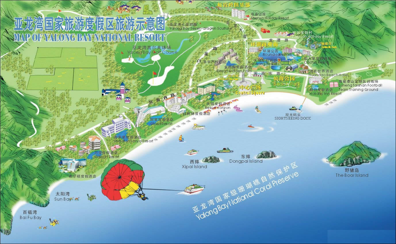 這里三面青山相擁,南面月牙型向大海敞開(kāi)。除陽(yáng)光、海水、沙灘俱佳外,尚有奇石、怪灘、田園風(fēng)光構(gòu)成了各具特色的風(fēng)景。錦母角、亞龍角激浪拍崖,怪石嶙峋,是攀崖探險(xiǎn)活動(dòng)的良好場(chǎng)所。海面上以野豬島為中心,南有東洲島、西洲島,西有東排、西排,可開(kāi)展多種水上運(yùn)動(dòng)。亞龍灣中心廣場(chǎng)有高達(dá)27米的圖騰柱,圍繞圖騰柱是三圈反映中國(guó)古代神話傳說(shuō)和文化的雕塑群。廣場(chǎng)上,四個(gè)白色風(fēng)帆式的尖頂帳篷,給具有古老文化意蘊(yùn)的廣場(chǎng)增添了現(xiàn)代氣息。