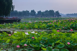 白洋淀荷花大觀園坐落在河北省濕地保護(hù)區(qū)安新縣白洋淀景區(qū)內(nèi),占地2000多畝,水域面積1560畝,薈萃了中外名荷699種,花的顏色有紅、黃、白、粉、淡綠等,花型有單層、雙層、多層,株型有小到可置案頭的碗蓮,有大到能負(fù)重幾十斤的南美王蓮。
