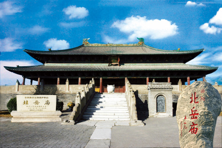 北岳廟,原名“北岳安天元圣帝廟”。位于保定市曲陽縣境內(nèi),是漢代和清朝封建皇帝遙祭北岳恒山的地方。北岳廟建于北魏宣武帝年間(500~515年),唐開元二十三年(735年)擴建。明嘉靖年間(1522~1566年),北岳廟規(guī)模達到頂峰。清順治十七年(1660年),改祀北岳于山西渾源,曲陽北岳廟逐漸荒廢。北岳廟主要建筑平面布局呈“田”字形,長達542米、寬321米,坐北朝南排列在一條垂直中軸線上,由南往北依次為登岳橋、神門、牌坊、朝岳門、御香亭、凌霄門、三山門、飛石殿、德寧之殿、后宅門、望岳橋。