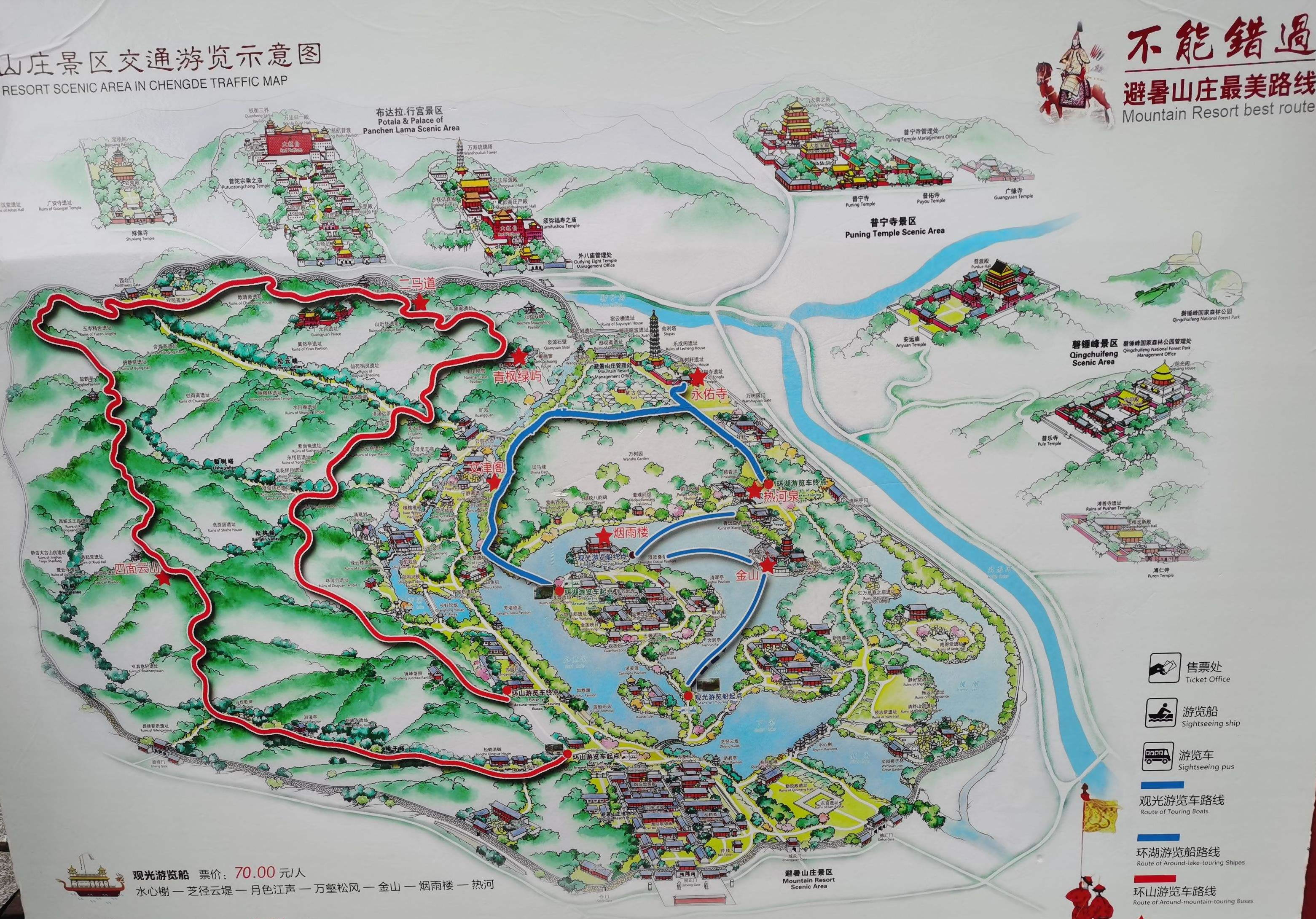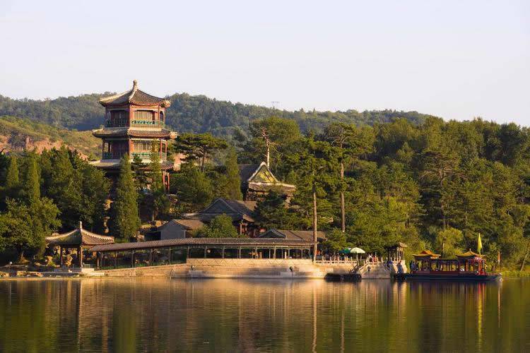 山巒區(qū):位于山莊西北部,面積443.5萬平方米。山區(qū)占了整個園林面積的五分之四。從西北部高峰到東南部湖沼、平原地帶,相對高差180米,形成了群峰環(huán)繞、色壑縱橫的景,山谷中清泉涌流,密林幽深。高聳的山峰好似天然屏障,阻擋了西北寒風(fēng)的侵襲,是調(diào)節(jié)山莊氣候的重要因素。當年利用山峰、山崖、山麓、山澗等地形,修建了多處園林、寺廟,共計40余處。