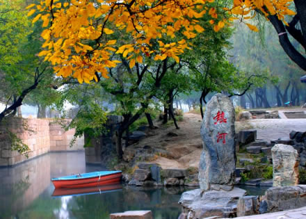 熱河泉位于山莊湖區(qū)東北隅,是山莊湖泊的主要水源。清澈的泉水從地下涌出,流經(jīng)澄湖、如意泅、上湖、下湖,自銀湖南部的五孔閘流出,沿長堤匯入武烈河。熱河全長700多米,在一般地圖上找不到它有蹤跡。它是中國最短的河流。熱河發(fā)源于避暑山莊諸泉的一條涓涓細流,主要水源來自熱河泉。冬季水溫為8℃。泉側(cè)有巨石,刻“熱河”兩字。