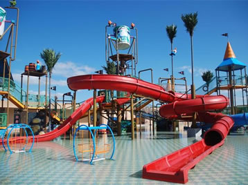 寶貝水城:小孩子的玩水樂園、歡樂的造夢空間。典型設(shè)備包括蝴蝶滑梯、青龍滑梯、鱷魚滑梯等設(shè)備,還有蝸牛號、椰果派、水風(fēng)車、向陽花、七彩蘑菇、彩虹門、三色花、鳥語花香、小妖精等可噴水可觀賞的童趣水景。寶貝水城色彩鮮艷,設(shè)施眾多,小孩們可以盡情嬉戲玩耍,激發(fā)兒童無窮的想象力和創(chuàng)造力。