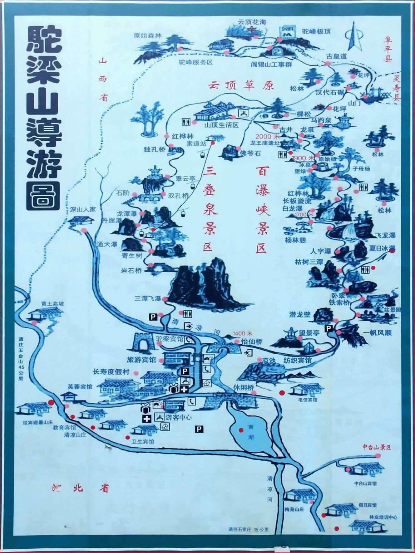 駝梁自然風(fēng)景區(qū)位于河北省平山縣西北部,東距省會(huì)石家莊市150公里,西距佛教圣地五臺(tái)山45公里,北起駝頂,南至四道溝(又稱南溝),長(zhǎng)5公里;東自峰脊,西至山西省界,寬約4公里,總面積為22平方公里,主峰海拔2281米,是平山、阜平、山西五臺(tái)三縣的分水嶺,為河北省五大高峰之一,在當(dāng)?shù)乇环Q為“小泰山”,素有“省會(huì)屋脊”之稱。駝梁之名,是因山頂兩峰此起彼伏,形如駱駝峰脊而得。山體屬典型的變質(zhì)巖地貌結(jié)構(gòu)。以奇、秀、高、遠(yuǎn)聳立于巍巍太行,更以涼、幽、靜、野而馳名華北,久享“太行綠寶石”美譽(yù)。由四道溝入山,沿碎石路蜿蜒而上,兩側(cè)青山聳立,怪石磷峋,松生崖,虬藤攀緩,路邊流水撫石,樹間小鳥鳴唱,好一派風(fēng)光。