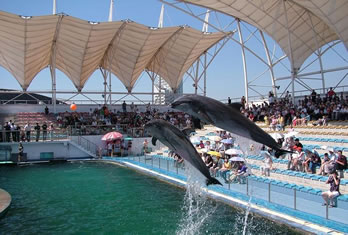 海豚表演館于2000年5月1日正式營業(yè),投資近6000萬元人民幣,占地面積約3000平方米。三面環(huán)座的看臺可同時容納2000名游客,站在看臺極目遠眺,表演池和大海仿佛融為一體。在優(yōu)美音樂的伴隨下,不僅可以欣賞到海豚的水中華爾茲、空中頂球、跳圈、跨桿、環(huán)場鞠躬跳等高難度的精彩表演;還可以領(lǐng)略海獅投籃、水中霹靂舞、中國功夫等出色的演技;同時您還有機會親身觸摸海豚,與它握手交流,共同感受人與自然默契相通的美好境界。