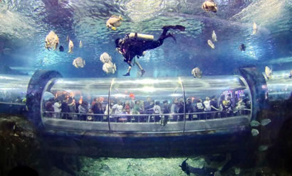 海底世界水族館飼養(yǎng)著來自世界各地的海洋動物200多種,共10,000多艉(頭),其中有大量國家一級、二級珍稀保護動物,檸檬鯊、豹紋鯊、護士鯊、海豚、江豚、綠海龜、海獅、海豹、蝠鲼、海狗供游人觀賞。270度環(huán)形的亞克力玻璃圍成的海底隧道全長100米左右,五光十色的珊瑚環(huán)繞在您的周圍,迷人的海底動植物盡收眼底。透過窗口還可以看到一個古羅馬被海水淹沒城市的石像造景。海豚表演館占地面積1萬平方米,建筑面積3,000平方米,總貯水量200萬千克,能同時容納2000多人同時觀看表演,以展示生活在海洋中哺乳動物的海獸表演為主,是一座具有國際標(biāo)準(zhǔn)的海洋動物表演劇場。游客在此可以看到聰明可愛的海豚和滑稽可笑的海獅聯(lián)袂上演精彩紛呈的各項表演:海獅獻上迪斯科、倒立平衡、一獅兩球、套彩圈、單手倒立、頂球過障礙、親吻、水中交誼舞等一系列惟妙惟肖的表演;海豚上演的水中芭蕾舞、踢足球、環(huán)場鞠躬跳躍、伴著樂曲引吭高歌以及充分展示海豚智力的各種表演活動。