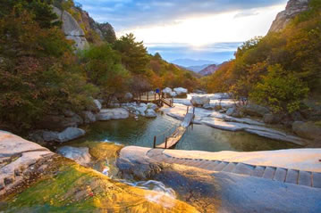 夏季,風(fēng)涼氣爽,云蒸霞蔚。登臨主峰,可觀云海,看日出,瞧佛光,俯群山。云海、云流、云瀑是祖山夏季的特有景觀。因祖山海拔較高,又瀕臨渤海,此時(shí)登臨任何峰頂,可觀到滔滔的云海,觸摸到擦肩而過的朵朵白云,她們一會(huì)兒行云流水,環(huán)山而淌;一會(huì)兒宛如融雪的春潮,裊裊地升入蔚藍(lán)的天空;一會(huì)兒像脫結(jié)的野馬,入海的姣龍,奔騰咆哮,排山倒海。當(dāng)你倘佯在“北龍?zhí)丁薄ⅰ盎ü健本皡^(qū)時(shí)俯看谷中,涓涓細(xì)流,清澈見底;仰望山間,瀑布飛掛,奔騰咆哮,大有“飛流直下三千尺,疑是銀河落九天”之氣魄沿溝谷而下,那真是水繞青山,山繞水,山浮綠水,水浮山。