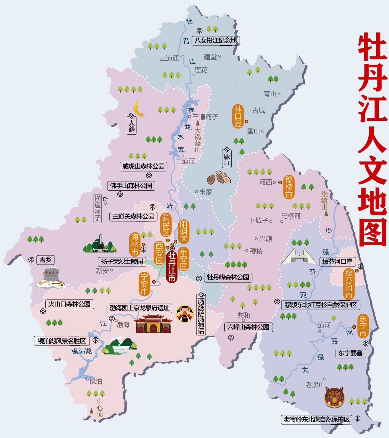 牡丹江市轄4個(gè)市轄區(qū)、1個(gè)縣,代管5個(gè)縣級(jí)市: