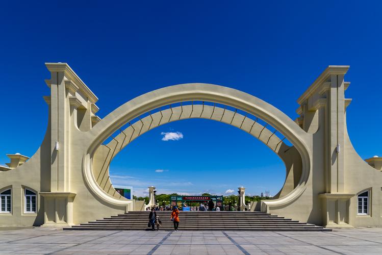 太陽(yáng)島大門(mén)即太陽(yáng)之門(mén),坐落在太陽(yáng)島西部主入口處。太陽(yáng)門(mén)全長(zhǎng)68米,兩端向太陽(yáng)石方向環(huán)抱,主門(mén)高12.03米。大門(mén)為一大四小五個(gè)橢圓拱型門(mén)相連組成,其造型以新藝術(shù)運(yùn)動(dòng)風(fēng)格的建筑語(yǔ)言為主,并揉以其他風(fēng)格的藝術(shù)語(yǔ)言,其創(chuàng)意主題為“太陽(yáng)的窗口”。中間的拱型大門(mén)和太陽(yáng)島巨石在同一中軸線上,行進(jìn)方向?yàn)檎龞|正西,由此可以面向日出日落,四座小拱門(mén)中矗立著四座雕塑。門(mén)前的巨石,坐落在光輝四射的太陽(yáng)圖案中心,腳下是模擬的哈爾濱市街區(qū)圖。