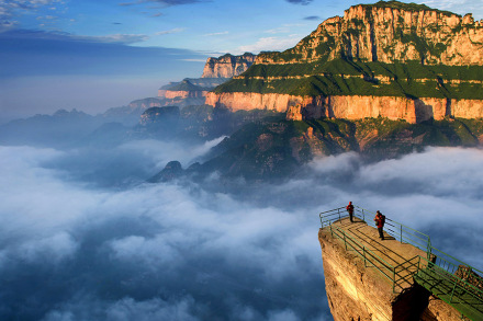 云峰畫廊是一條畫廊式的風(fēng)光帶,位于老爺頂?shù)陌肷窖汕宸尻P(guān)起,環(huán)周8千米,終點(diǎn)又回到清峰關(guān)。它依附老爺頂,連接豫晉關(guān),遙望十字嶺,擷取太行山的精華,依山順勢建造了7個(gè)位置極佳的觀景臺,依次為聽禪臺、試膽臺、如畫臺、戲龍臺、丹鳳臺和歸真臺。