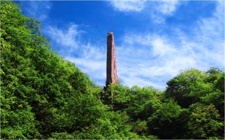 天碑高達50余米,是一個巨型崩塌巖塊。由于崩塌時的位移,原來近水平產出的巖層此時呈直立狀,巍然聳峙在峽谷一側,高大雄偉、氣勢恢弘,一景多變,步移景換,從不同角度仰望,或蒼鷹、或飛鳥、或飛魚、或刀背、或天碑,大自然賦予其無限美感。傳說,這本是二郎神斬殺小白龍的大刀,圣母媧皇在安置了小白龍神位之后,又把二郎神丟下的大刀豎立起來,刀背對著無頭冤神洞,于是二郎神斬殺小白龍的大刀,成了紀念小白龍的無字碑,人們稱其為“擎天刀碑石”。