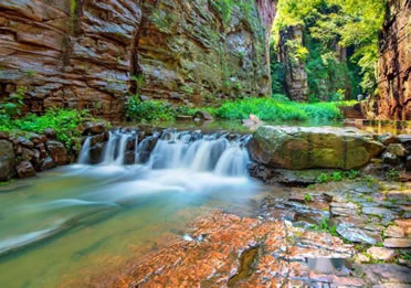 龍?zhí)洞髰{谷景區(qū)是王屋山——黛眉山世界地質公園的核心景區(qū),是一條以典型的紅巖嶂谷群地質地貌景觀為主的峽谷景區(qū)。谷內關峽相望,潭瀑聯珠,壁立萬仞,峽秀谷幽,經過十二億年的地質沉積和260萬年的水流切割旋蝕所形成的高峽甕谷、山崩地裂奇觀,堪稱世界一絕,人間少有,享有“中國嶂谷第一峽”、“古海洋天然博物館”、“峽谷絕品”和“黃河水畫廊”等美名。
