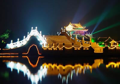 開封是中國六大古都之一,作為北宋王朝的都城達(dá)167年之久。當(dāng)時的宋京極為繁盛,宮殿建筑很輝煌。可惜金人侵占開封時,宋皇宮建筑大部分被燒毀了。后來,又經(jīng)過多次兵燹和黃河決堤,宏偉的宮室已蕩然無存。在過去皇宮遺址上只留下了龍亭公園這座的建筑物,而這座龍亭公園卻是清代所建。龍亭公園坐北朝南,高踞在臺基之上。從地面到大殿有72級臺階。臺階中間是雕有云龍圖案的石階。登上平臺,四周有石欄圍繞。大殿是木結(jié)構(gòu),重檐歇山式建筑,很壯觀。游人登上平臺,入殿觀看陳列的文物后,多在石欄前眺望開封古城景色。龍亭公園前有一條筆直的大道,道旁有兩個東西對峙的湖,東為潘湖,西為楊湖。傳說,東湖為宋朝“太師”潘美的府第,他陷害忠良,是個奸臣,宅院里的湖,水是渾的;西湖為宋朝搞遼名將楊業(yè)的府第,他舍身救國,是個忠臣,宅院里的湖,水是清的。這個說法沒有科學(xué)根據(jù),但反映了人們對忠奸的態(tài)度和感情,F(xiàn)在龍亭公園,潘、楊兩湖,以及龍亭公園后面的假山花園,都辟為龍亭公園公園。從龍亭公園前的大道,過潘、楊兩湖,再往南,仍是一條筆直的大道,兩旁店鋪林立,這條大道歷史上是一條寬闊的御道。