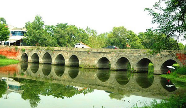 老城九孔橋:自明弘治十年(公元1497年)到建國后的1950年10月老城鎮(zhèn)一直是沈丘縣治所所在地,城南緊靠東西流向的泉河,當(dāng)時(shí)河寬水深,各種貨物可上通漯河,下達(dá)臨泉、潁州(現(xiàn)阜陽市),經(jīng)潁上至正陽入淮河,當(dāng)時(shí)是一條繁盛的“黃金水道”。但城南無橋,南北兩岸大量人員來往,貨物運(yùn)送,全靠船渡,因水大、人多、貨物超載或遇急風(fēng)惡浪,每年都有事故發(fā)生。1973年、1981年沈丘縣人民政府兩次撥款4.1萬元,維修九孔橋。因九孔橋是周口至臨泉的主要交通干道,經(jīng)常有幾十噸的大貨車在橋上行駛,常年承受著交通重載,所以到1998年南橋頭西側(cè)倒塌了十幾米,致使車輛無法行走。1999年,沈丘縣人大代表、老城東升布鞋廠廠長郭傳興個(gè)人出資5萬元,南關(guān)行政村支部書記張連營負(fù)責(zé)施工補(bǔ)修,把橋加長4米,全橋長達(dá)99米,19天后竣工。現(xiàn)橋體基本完好,車輛行人稱便。
