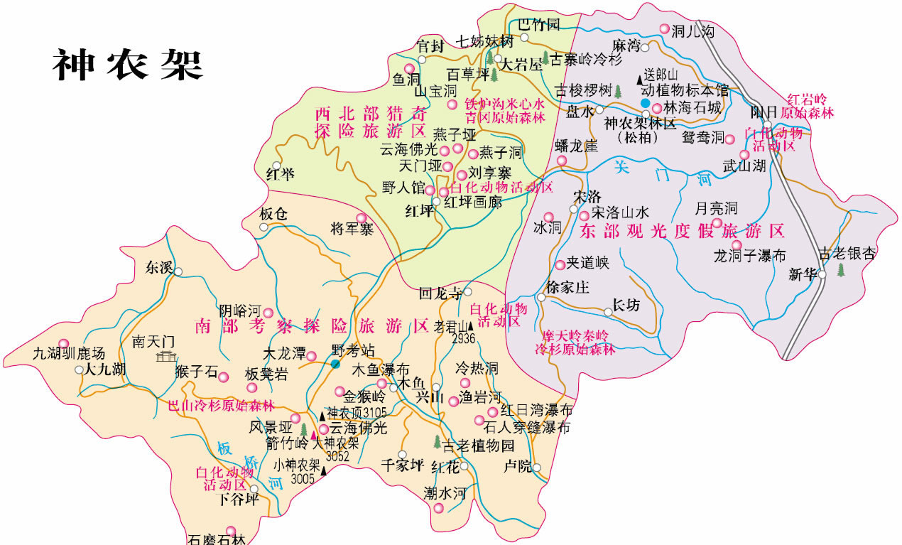 神農架是位于湖北省西部一片群峰聳立的高大山地,橫亙于長江、漢水之間,方圓3250平方公里,相傳因上古的神農氏在此搭架上山采藥而得名。景區(qū)山峰均在海拔3010米以上,堪稱“華中屋脊”。是以秀綠的亞高山自然風光,多樣的動植物種,人與自然和諧共存為主題的森林生態(tài)旅游區(qū)。 神農架主要景點有神農頂、風景埡、板壁巖、瞭望塔、小龍?zhí)、大龍(zhí)丁⒔鸷飵X等,以原始、神秘聞名于世,區(qū)內山高谷深,林木茂密,氣候復雜多變,四季景色迷人。獨特的自然環(huán)境、人文歷史,造就了極其豐富、珍貴的自然和人文景觀,也孕育了景色宜人、鐘靈毓秀的旅游環(huán)境,有“神農天園”之稱。