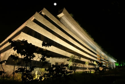 黃龍音樂廳位于生態(tài)廣場入口處,由黃龍洞投資股份有限公司按國際標(biāo)準(zhǔn)建設(shè),建筑面積為4970平方米,總投資1.6億元,座位818個。該音樂廳背靠植被茂盛的黃龍洞山體,面朝浩瀚的稻田,南鄰潺潺東流的索溪水。整個建筑為框剪式結(jié)構(gòu),3250平方米斜坡面屋頂全部為綠茵花草屋蓋,是全球最大的綠化屋頂;其外墻由當(dāng)?shù)厍嗍搸r構(gòu)建成的音符弦線幕墻與自然融合一體,形如一本即將展開等待世人閱讀的張家界文化寶典,又如鑲嵌在張家界的一塊翡翠,被譽為“世界環(huán)境最美音樂廳”。