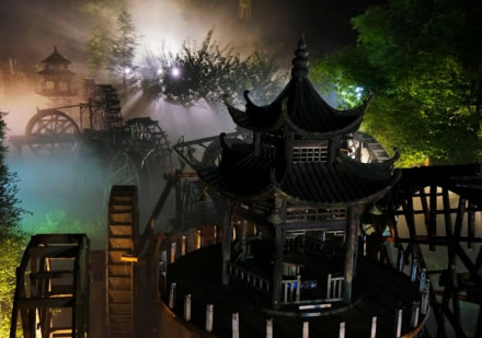風(fēng)雨長廊位于田園牧歌景觀區(qū)東頭,取臥龍之形,伸展于山谷之中,從田野一直延伸到黃龍洞進口。風(fēng)雨長廊為木質(zhì)吊腳樓穿斗結(jié)構(gòu),做工十分精細,榫卯巧妙連接,雖然不用一顆鐵釘?shù)珔s非常穩(wěn)定、堅固。置身長廊,不僅可以防止日曬雨淋,還可以品讀富有地域特色的湘西建筑文化。