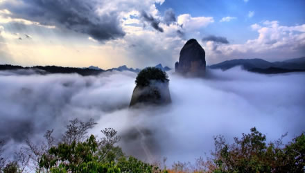 武岡云山,云山,湘西南名山,屬雪峰山余脈,以云多奇幻而得名。位于武岡市城南5千米處,東西綿延數(shù)十里,毗連著武岡、新寧、城步三縣疆界。最高峰海拔1372.5米,為國(guó)家級(jí)森林公園和國(guó)家3A景區(qū)。分伴山?jīng)_、云山堂、紫霄峰幾大景區(qū),景區(qū)中云海、古樹、流泉、溪澗、瀑布、幽谷、山峰、怪石、古剎、靈寺、古道、古跡一應(yīng)俱全,被譽(yù)為"楚南勝地"。始建于三國(guó)吳國(guó)時(shí)勝力寺,寺廟面積2500平方米,寺內(nèi)有彌勒殿、大雄寶殿、觀音殿等,建筑完好,為湘西南著名的宗教文化活動(dòng)場(chǎng)所和游覽勝地。1982年被列為國(guó)家自然保護(hù)區(qū),1992年9月經(jīng)原國(guó)家林業(yè)部批準(zhǔn)建立國(guó)家級(jí)森林公園。