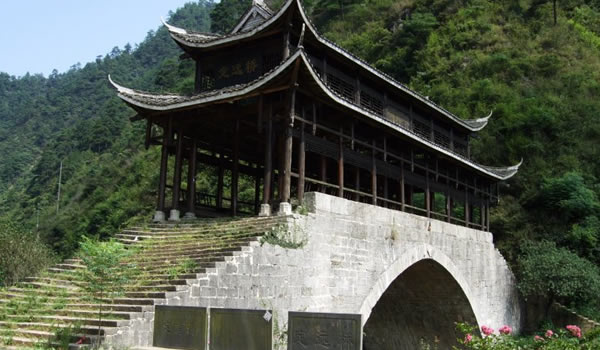 定遠橋 定遠橋位于綏寧縣關(guān)峽鄉(xiāng),是綏寧縣知縣范成龍捐獻自己的俸祿銀子于康熙二十三年(1684年)修建。橋長一十二丈六尺,寬二丈六尺,高五丈六尺,單孔,半圓拱。橋面用青石鋪面,青石已被磨得油亮發(fā)光,橋頂屋架木瓜、懔條緣皮、青瓦翹檐、瓦頭潔白,橋依山而建,古樸威嚴;亭為杉木架構(gòu),卯榫嵌合,不用一釘,圓石為礎(chǔ),巨木為柱,片板為欄,長方為座,可供憩息,可避風雨。由于這里的險關(guān)隘口天然生成,為歷代兵家要塞,故名關(guān)峽;現(xiàn)為湖南省保護文物; 橋下的“蘭溪”溪水清澈見底,水流湍急,水似一把利刃,把猴子山一劈兩開穿山而過。 |