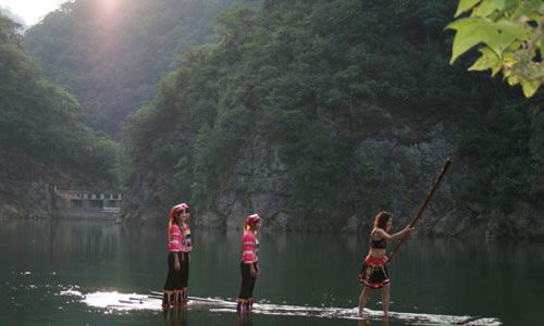 日月湖又名瀧泊平湖,即雙牌水庫。系1960年建成。壩址在縣城以南4公里瀧泊灘口,系湖南省重點水利工程,水庫全長30余公里。遠眺水壩巍峨雄偉,原中共中央中南局書記陶鑄親筆題寫的“雙牌水庫”四個大字,鑲刻在大壩頂端。昔日“下瀧船似入深淵,上瀧船似欲升天”的驚險水道,如今變成幽美的平湖。若乘舟駛向水鄉(xiāng)澤國的江村鎮(zhèn),沿途可見水光瀲滟,山花爛漫,鳥鳴林密,層巒倒影,魚翔深潭,妙趣無窮,令人流連忘返。