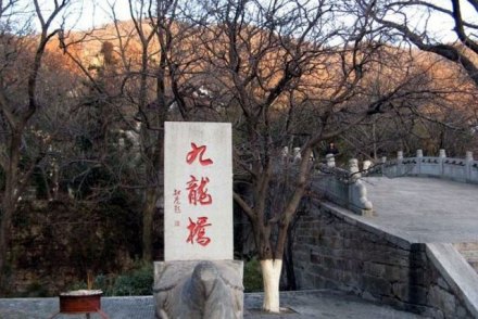 九龍橋是因?yàn)樯缴嫌芯艞l山澗像九條舞動著的龍,從四面八方匯集于橋下而得名。那時(shí)候百姓都相信龍是神,一些香客就在此橋小憩一刻,來沾一點(diǎn)龍的壽氣,再進(jìn)山求佛,保全家萬事平安,因此九龍橋又叫萬壽橋。傳說花果山上原來有十條龍,九條龍?jiān)谏嚼锩孀≈,為了防止外族侵犯,便派了一條本事最大的禿龍到東面的山頭守衛(wèi)。山東莊還有禿龍山,那龍山上還有兩個(gè)對穿的山泉就是傳說中的龍耳。我們可以在橋上往南望,那遠(yuǎn)處的村莊便是山東莊。九龍橋畔有一棵千年老銀杏,粗大的枝椏已經(jīng)擠進(jìn)了橋身,橋上橋下布滿樹蔭,給游客提供了休息納涼的理想場所。