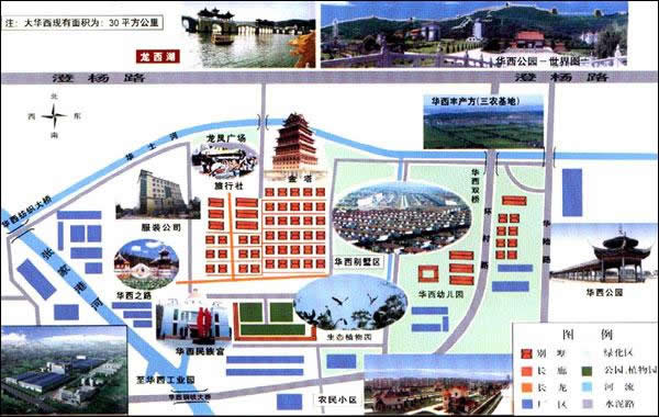 村頭粉墻照壁,后為廣場。廣場上數(shù)十旗桿,飄揚(yáng)著各種圖案的彩旗,這是華西實(shí)業(yè)公司所屬工業(yè)的標(biāo)志,顯示出它的經(jīng)濟(jì)實(shí)力,產(chǎn)值數(shù)十億,產(chǎn)品遠(yuǎn)銷國外。