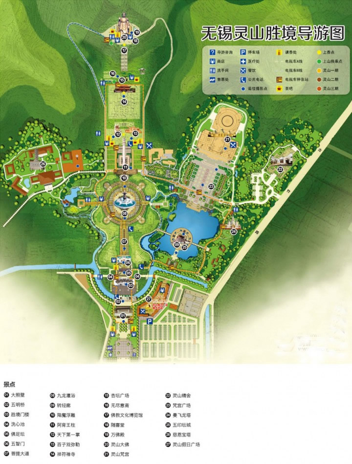 從杏壇廣場往上,攀218級登云道,看六角古井,觀七級浮雕,于大佛基座游覽靈山佛教文化博覽館。博覽館以神州五方五佛、中華四大佛山、藏傳、南傳、漢傳三大佛教語系以及佛教丈化藝術(shù)為展覽主線,充分展示博大精深的佛教文化。自博覽館乘電梯而上,游客還可參與“平安抱佛腳”活動,登高望遠,憑欄臨風,近可觀景區(qū)全景,遠可觀太湖湖光山色。從大佛足部步行而下,可參觀靈山萬佛殿。靈山萬佛殿供奉著近萬尊靈山大佛之真身小佛像,供游人瞻拜迎請。2000年靈山景區(qū)新增兩處精彩景點。大型青銅浮雕“百子戲彌勒”喜慶吉祥,深受游客喜愛。位于大佛腳下二層的靈山隨喜堂是靈山的又一處綜合展示佛教丈化的神圣殿堂,將令您嘆為觀止,并有品種多樣的佛教工藝禮品給您選購。