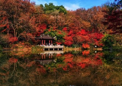 自明代以來就有“春牛首、秋棲霞”之說,“棲霞丹楓”為新金陵四十景之一,山西側(cè)的楓嶺有成片的楓樹,是棲霞山吸引游人的主要景致,為中國四大賞楓勝地之一。棲霞紅葉種類很多,尤以楓香為主,包括紅楓、雞爪槭、三角楓、羽毛楓、櫸樹、黃連木等,每到深秋,山中漫山紅遍,猶如晚霞棲落,蔚為壯觀。