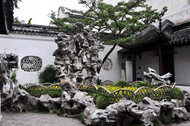 蘇州園林的植物配置基調(diào)是以落葉樹為主,常綠樹為輔。用竹類、芭蕉、藤蘿和草花作點(diǎn)綴,通過孤植和叢植的手法,選擇枝葉扶疏、體態(tài)瀟灑、色香清雅的花木,按照作畫的構(gòu)圖原理進(jìn)行栽植,使樹木不僅成為造景的素材,又是觀景的主題。許多樹木的種植與園林建筑和詩詞匾聯(lián)、人物典故相呼應(yīng),喻情于草木。獅子林的植物配置亦照此理,東部假山區(qū)以古柏和白皮松為主,西部和南部山地則以梅、竹、銀杏為主。配植色香態(tài)俱佳的花木,疏密相間,錯(cuò)落有致,不僅增加了林木森郁的氣氛。更使山石、建筑、樹木溶合一體,而成為真正的“城市山林”。指柏軒前假山上有元代古柏?cái)?shù)株,有白皮松五棵,姿態(tài)蒼勁,皆成畫意。暗香疏影樓和問梅閣推窗可見三、五株梅,疏影橫斜,暗香浮動(dòng)。尤其問梅閣中桌椅、吊頂都是梅花形,窗紋用冰梅紋,書畫內(nèi)容亦與梅有關(guān),與地上“冰壺”古井共同構(gòu)成一幅思鄉(xiāng)的畫卷。更有文天樣《梅花詩》:“靜虛群動(dòng)息,身雅一身清;春色憑誰記,梅花插座瓶”,借梅詠懷,體現(xiàn)了文天祥正氣凜然的高尚情操。山石間有六百年年銀杏一株,粗干老木,盤根錯(cuò)節(jié)于石隙間,夏日濃蔭庇日。秋葉燦若織錦,成為獅子林中一美景。