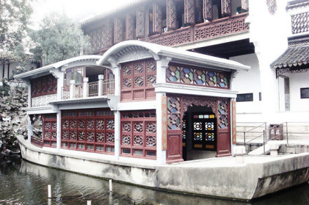 石舫,又稱旱船,人稱“不系舟”。位于獅子林水池西北,建于民國初年,系二十世紀(jì)最后一位園主所建。石舫中、后艙均為兩層,四周安有86扇鑲嵌彩色玻璃的和合窗。舫身四面皆在水中,船首有小石板橋與池岸相通,猶如跳板。船身、梁柱、屋頂為石構(gòu),門窗、掛落、裝修為木制。前艙聳起,屋頂呈弧形曲面,中船低平,屋頂為平臺(tái),屋艙上下二屋,有樓梯相通。其制作精巧,造型逼真,細(xì)部花飾已帶有一些西洋風(fēng)味。