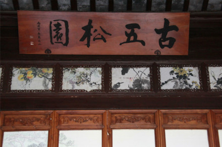 清康熙時(shí)獅子林內(nèi)有五棵參天古松,故獅子林又名五松園。古五松園現(xiàn)為東西向廳堂,“古五松園”匾由蘇局仙題。匾額下,吳致木先生作絹質(zhì)五松聯(lián)屏一幅。
