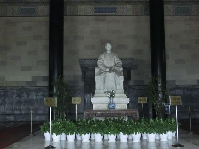 祭堂中央供奉孫中山坐像,高4.6米,是世界名雕刻家保羅朗特斯基在法國巴黎用意大利白色大理石雕像,底座鐫刻六幅浮雕,是孫中山從事革命活動的寫照。孫中山先生身著長袍馬褂,高額廣頤,手持一本長卷,那凝視著前方的深邃目光,那凝重的身軀,給肅立于此的人們以難忘的啟迪。