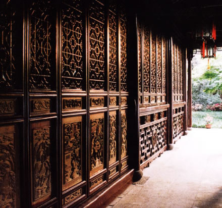秫香館:秫香,指稻谷飄香。此處以前墻外皆為農(nóng)田,豐收季節(jié),秋風(fēng)送來一陣陣稻谷的清香,令人心醉,館亦因此得名。秫香館為東部的主體建筑,面水隔山,室內(nèi)寬敞明亮,長窗裙板上的黃楊木雕,共有48幅,雕鏤精細(xì),層次豐富,栩栩如生。落地長窗加上精致的裙板木雕,把秫香館妝點得古樸雅致,別有情趣。