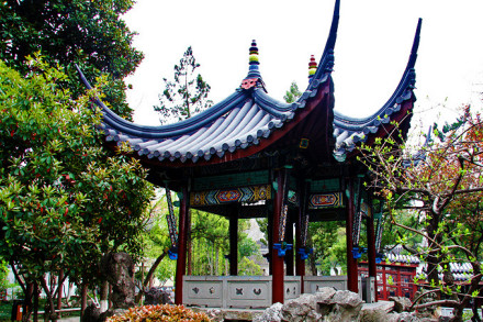方勝亭,俗稱"鴛鴦亭",是民國前江南惟一的方勝亭。方勝,又稱雙菱,指兩菱形相疊。亭基方勝,上為雙頂、遠(yuǎn)觀似雙亭并立,近看卻一亭獨(dú)佇,小巧玲瓏,頗為別致。飛檐翹角,如欲飛的鴛鴦。梁柱間有很大的彩繪"雀替木",這是清代建筑的特征之一。因其少用斗拱,為出挑檐,只得加大這種斜角支撐物。亭里可見一些龍鳳獅虎等動(dòng)物形狀的刻繪。