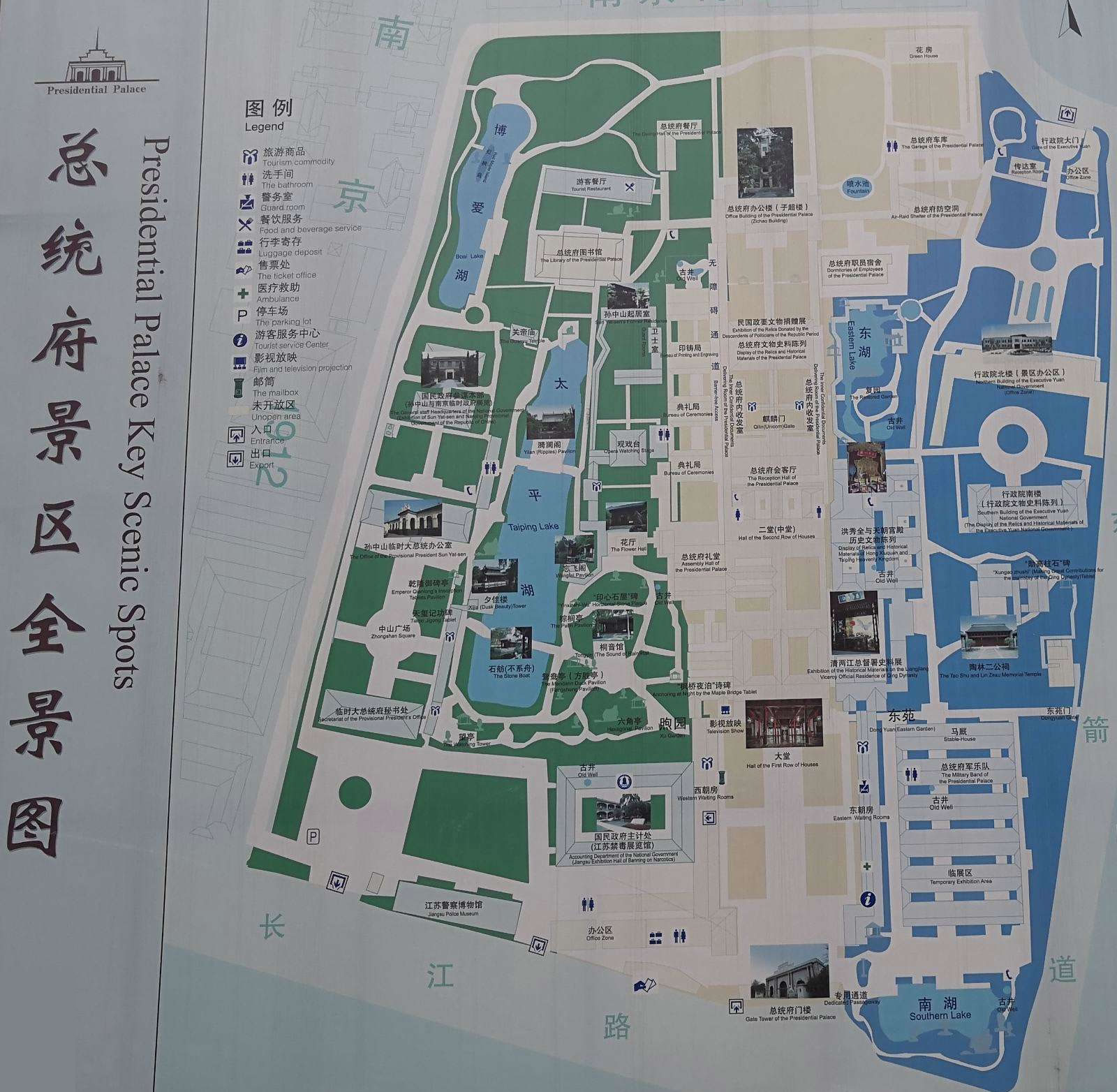 總統(tǒng)府(中國近代史博物館)占地面積9萬平方米,共分三個(gè)參觀區(qū)域。中區(qū)(中軸線)主要是國民政府、總統(tǒng)府及所屬機(jī)構(gòu);西區(qū)是孫中山的臨時(shí)大總統(tǒng)辦公室、秘書處和西花園,以及參謀本部等;東區(qū)主要是行政院舊址、馬廄和東花園。一系列展館和史料陳列,則分布在這三個(gè)區(qū)域中。