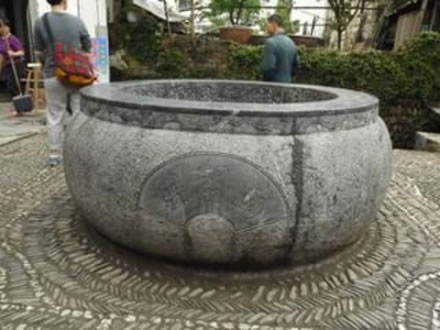 北斗七星井位于江西省上饒市婺源縣江灣鎮(zhèn)江灣景區(qū)內(nèi),北斗七星井體現(xiàn)了”天、地、人合一”的中國風(fēng)水學(xué)最高原則,南側(cè)梨園河呈太極圖“S”形系。北宋初年,南唐國師何令通遭貶來到江灣靈山隱居,與蕭江六世祖江文采交往甚篤,便指引蕭江氏族人由旃坑遷居風(fēng)水寶地云灣(現(xiàn)為江灣)。蕭江先祖在他的指引下,利用風(fēng)水學(xué)的最高原理,對江灣的水系環(huán)境、建筑布局、街衢走向,山脈走勢等方面進(jìn)行了改造。族人自遷云灣后人丁日益興旺、科第舉發(fā),其中村內(nèi)的北斗七星井便是國師運用風(fēng)水學(xué)的典范。 中國古代的四個方位分別是“前朱雀后玄武、左青龍右白虎”,而江灣的地勢是玄武(后龍山)偏低,朱雀(對面攸山)偏高,朱雀屬火,也就是說南方火勢較旺,是一個較為不利的地形。當(dāng)時何令通便想出在村中挖七口井,并按北斗七星狀分布,以七井之水鎮(zhèn)住攸山火勢。而北斗七星分布又是呈勺子狀的,從此,村內(nèi)即有了充足水源又有了舀水的勺子,攸山之火自然就被鎮(zhèn)住了。