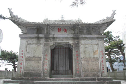 御碑亭位于廬山仙人洞一側的白鹿升仙臺上,是明朝皇帝朱元璋所建造的。明朝洪武二十六年九月(1393年)朱元璋為了紀念周顛仙等人就在這臺上建起了御碑亭。亭中至今還保存著朱元璋的御碑。碑上刻著這位朱皇帝親自撰寫的《周顛仙人傳》和《四仙詩》。這塊御碑高約4米、寬1.3米、厚0.23米。