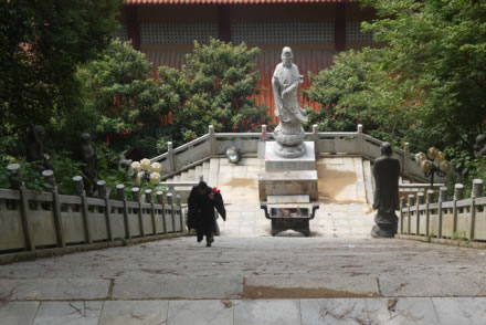 天寧古寺有過(guò)極盛的年華,隨著滄桑的變遷,屢經(jīng)摧殘,古寺蕩然無(wú)存。至1985年9月僅存一座高不到 二米、面積不足18平方米,風(fēng)雨飄搖的觀音間,神龕上只有一張圖像供游客參拜,當(dāng)年61歲的萬(wàn)仁英同志,誠(chéng)虔地來(lái)此剃發(fā)為尼,授法號(hào)叫釋順因,并將她多年的積蓄六千元贊助寺內(nèi)作經(jīng)費(fèi)。在古寺住持垂范下,用了七年時(shí)間,建成了一座氣派軒昂,規(guī)模宏偉的綜合性寺廟。建筑面積達(dá)五千平方米,屹立在灣里區(qū)南端,接待八方香客和游人。