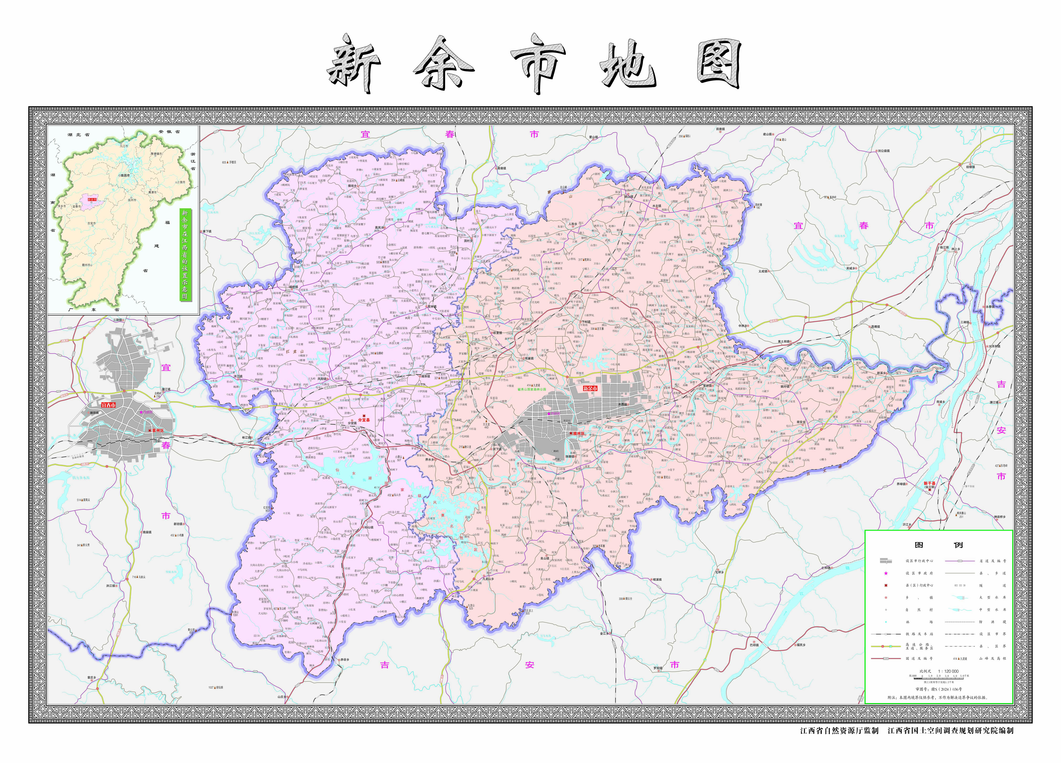 新余市位于江西省中部偏西,浙贛鐵路西段。全境東西最長處101.9千米,南北最寬處65千米,東距省會南昌市150千米,東臨樟樹市、新干縣,西接宜春市袁州區(qū),南連吉安縣、安福縣、峽江縣,北毗上高縣、高安市。總面積3178平方千米,占江西省總面積的1.9%。