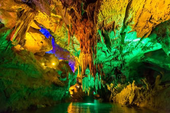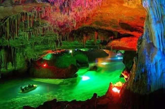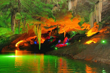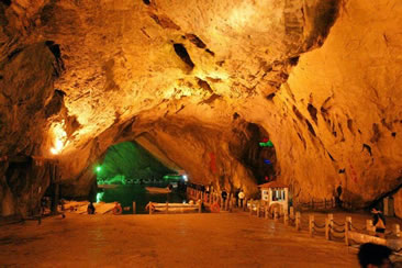通往水洞的碼頭,千余平方米的水面,宛如一幽靜別致的“港灣”,燈光所及,水中游船、洞中石景倒映其中,使人如入仙境。從護岸石階拾級而下,通過長廊從碼頭上船,即可暢游水洞。水洞全長5800米,現已開發(fā)2800米,面積3.6萬平方米,空間40余萬立方米,最開闊處高38米,寬70米。