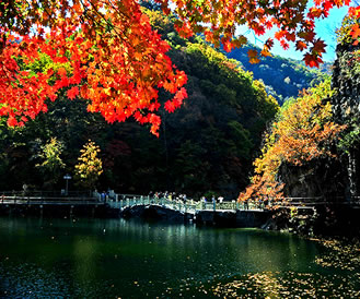 關(guān)門山是以楓葉著稱的,楓葉多得讓你數(shù)不過來(lái),美得讓你感覺像是走進(jìn)了仙境,紅得是一團(tuán)大火焰。這里的楓葉一片綴連著一片,一株綴連著一株,像火焰,像扇子,形態(tài)萬(wàn)千,千姿百態(tài)。關(guān)門山的楓葉不僅美麗,而且山也是那般雄偉,水也是那般清澈。