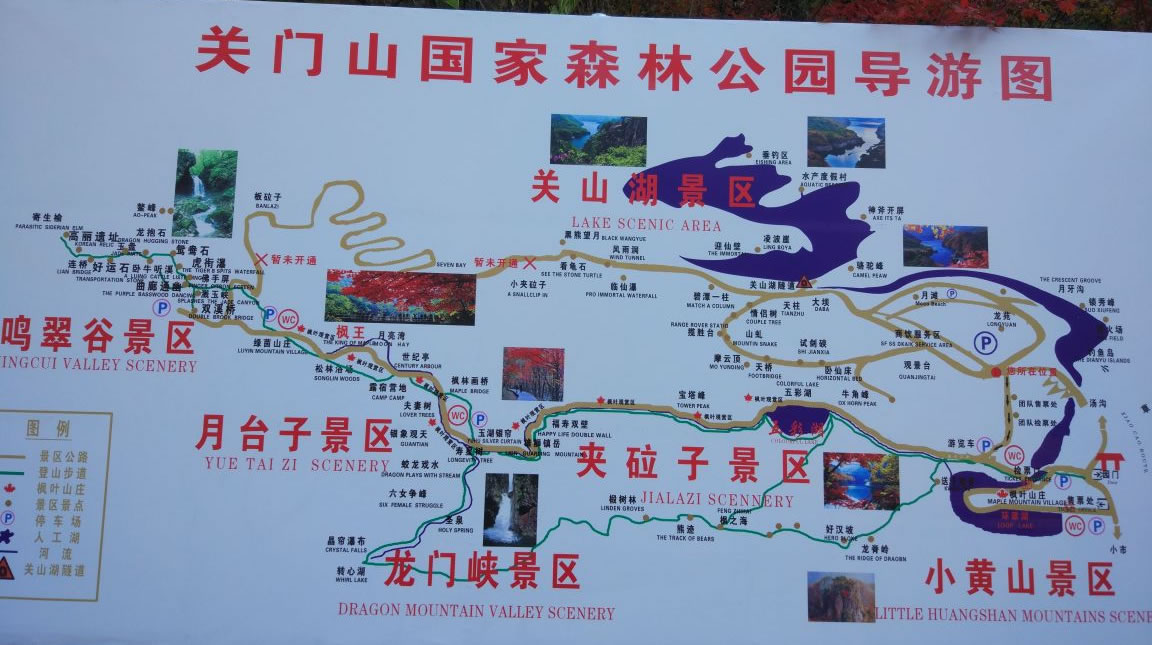 森林公園內(nèi)有四大景區(qū)小黃山景區(qū)、夾砬子景區(qū)、龍門峽景區(qū)和月臺(tái)子景區(qū),共計(jì)108處景點(diǎn)。它有三道門:北門,在小市方向,雙峰對(duì)峙,中間拱橋相連;南門,在去湯溝的嶺頂,公路從中穿過,十分險(xiǎn)要;中門,在深谷河道中,“雙扉”夾水,寬只二十余米,為興修水庫(kù)的天然門柱,有人把關(guān)門山風(fēng)景譽(yù)為“小江南”,“賽黃山”,說它有五美:山美,陡峭,俊秀,似一簇簇盆景;樹美,樹木種類繁多,特別是秋天的楓葉,冬季植根于峭壁上的蒼松,非常壯觀;水美,湯河穿過山谷,匯集小溪,飛瀑,“奪門”而出,似來(lái)自于天際;花美,天女木蘭,山杜鵑,漫山遍野;云美麗,清晨雨后,山谷中云霧繚繞,如披輕紗,分外嫵媚。歷代文人多有詩(shī)篇贊頌,許多美術(shù)工作者,經(jīng)常到這里寫生、作畫。