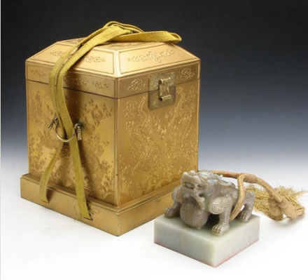 清世宗憲皇帝謚寶:此寶為嘉慶四年(1799)清宮內(nèi)府遵旨由舊寶改鐫而成。寶上部為單體蹲龍紐,描金,紐上系明黃絲繩。謚寶文字為滿、漢文合璧,均為朱文,右側(cè)為漢文篆書四行,左側(cè)為滿文篆書四行。其文為“世宗敬天昌運建中表正文武英明寬仁信毅睿圣大孝至誠憲皇帝之寶”。謚寶外包明黃織金四則團(tuán)花暗云紋錦包袱皮,用雙層龍鳳紋金漆套盒盛裝。該寶于嘉慶四年改鐫后由北京送至盛京太廟尊藏,清末民國時期存于沈陽故宮崇謨閣內(nèi)。