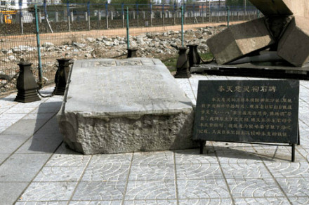 奉天忠靈祠石碑:日本帝國主義先后在沈陽建立了“日俄奉天大會戰(zhàn)紀(jì)念碑”和“靖國神社奉天分社忠靈祠、忠靈塔、忠靈碑”,用來埋葬侵華日軍在日俄戰(zhàn)爭至“九·一八”事變期間戰(zhàn)死者的36400多個將士的遺骨。