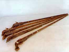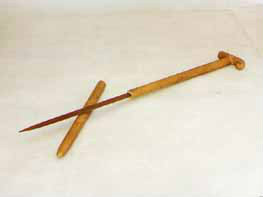 拐杖刀:俗稱“二人奪”,長約90厘米。表面上看呈拐杖型,木質(zhì)。但實際上,其前面是可以斷開的,拔出外鞘,里面是一個刺刀。這是抗日斗爭初期,東滿游擊隊和當(dāng)?shù)厝罕娪脕韺Ω稊橙说拿孛芪淦。是?dāng)時很流行很實用的武器。