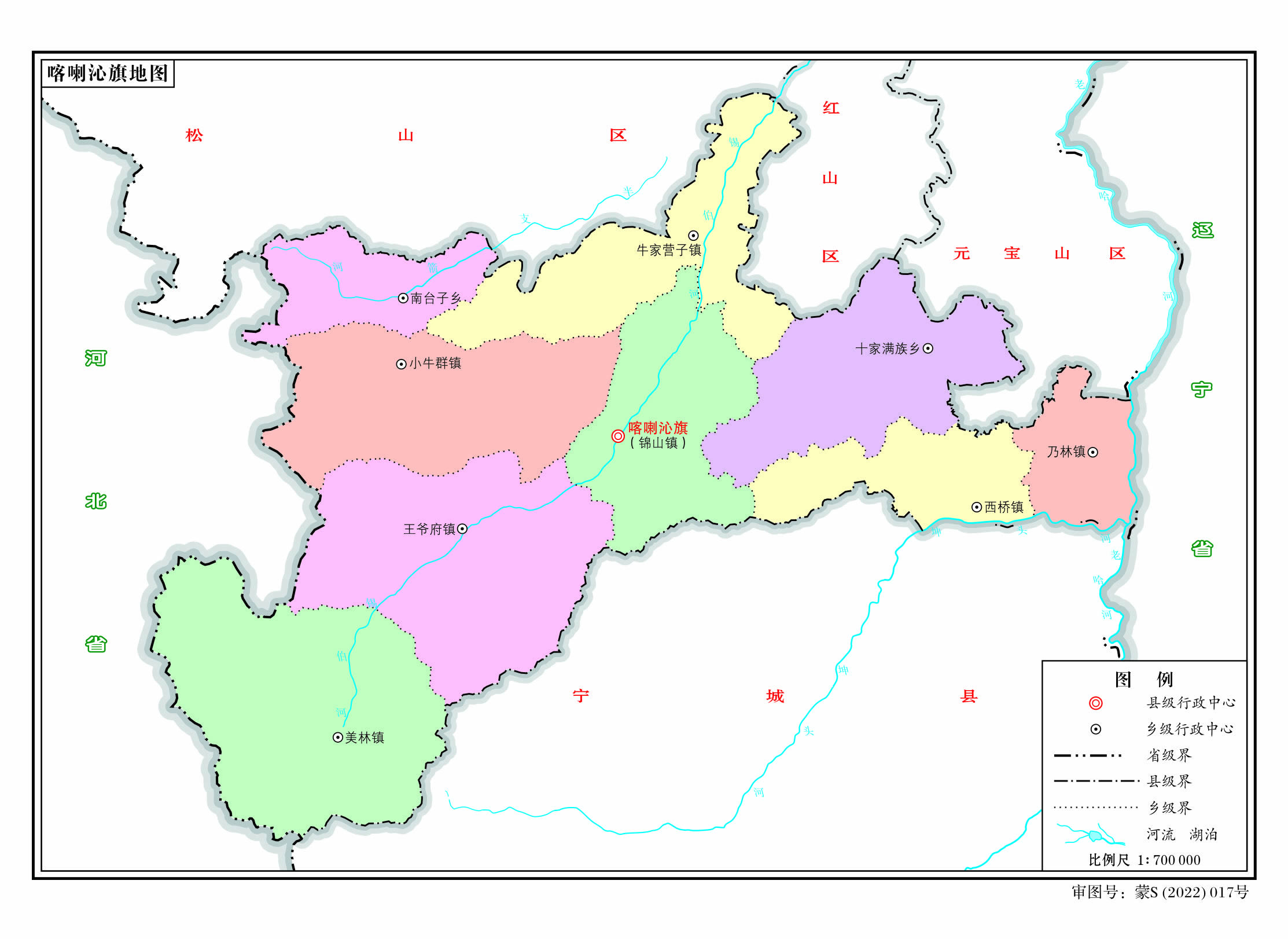 喀喇沁旗轄6個鎮(zhèn)、11個鄉(xiāng)(其中1個民族鄉(xiāng)),乃林果樹農(nóng)場、馬鞍山羊場: