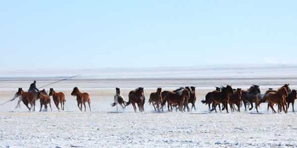 冬季那達慕 每年十二月,在巴彥呼碩敖包山上舉行,是冬季草原牧區(qū)生活的集中展示。雪地賽馬,賽駱駝,馬拉雪橇、雪地博克盡顯北方少數(shù)民族的豪氣和強悍,也是冬季風情和服飾的大展臺,是草原人們挑戰(zhàn)寒冷、超越自我的盛會。