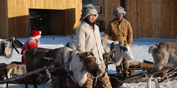 敖 生態(tài)環(huán)境 這里是森林與草原的界線,大興安嶺和呼倫貝爾大草原在這里交匯,一邊是草原、河流,一邊是森林、山崗,空氣新鮮,野味十足,當地人半當真的說"這地方絕對沒有污染,連蒼蠅、蚊子都是綠食食品"。 國家給敖魯古雅鄉(xiāng)人建立了定居地,但馴鹿只能生活在森林里,所以除了在定居點的部分村民,密林中還散布著五個馴鹿站,最遠的在150公里。過去,敖魯古雅人養(yǎng)馴鹿只是作為運輸工具,一頭馴鹿可以負重35公斤左右,每小時可以行走5公里,1964年,取得了割鹿茸成功。現在,馴鹿已經不大用來運輸了,而成了當地人的主要經濟來源,中國唯一的這群馴鹿大約只有10000只左右了。 敖鄉(xiāng)民俗村 敖魯古雅鄂溫克民俗村位于根河市西郊,南臨S301國道,交通十分便利。民俗村總建筑面積58,700平方米,是集大中型會議、休閑度假、民俗展示、娛樂為一體的綜合性旅游度假村,是一處自然——人文旅游 景觀。 民俗村依托森林、河流,鄂溫克獵民的民俗民風,推出一系列具有地方特色的旅游活動項目:主要有森林觀光、探險、模擬狩獵;觀民族宗教、歌舞、民俗表演;品嘗民族風味餐、參觀敖鄉(xiāng)新居、訪獵民等活動;村內建有木質別墅式的游客服務中心,民俗文化博物館、民俗表演平臺、表演廳和餐廳、反映鄂溫克獵民歷史的圖騰廣場、有四十、五十、六十年代不同的撮羅子,有上山索道車、木橋和四處風格獨特的獵民點;還有民俗表演隊和馴鹿車穿行其中,可對敖魯古雅鄂溫克獵民的歷史、文化、宗教、習俗進行了充分的展示。 敖魯古雅鄉(xiāng)距離我國最北端的漠河縣約一百公里左右的路程,位于大興安嶺深處的滿歸林區(qū)。這里氣候十分寒冷,記者走在蜿蜒的山路上,腳下的積雪發(fā)出“咯吱咯吱”的脆響,眼前已是呵氣成冰,身上的棉襖凍得硬梆梆的。隨行的鄉(xiāng)黨委書記鮑玉林說:“現在大約是零下30攝氏度,你們趕上好時候了,往年這個時候得有零下五十度,外面到處冒白煙。” 敖魯古雅鄉(xiāng)有一條主干道,長不過二三百米。道兩邊是整齊的幾排木刻楞房和磚瓦房,象征著主人的富裕程度。敖鄉(xiāng)雖小,卻擁有自己的博物館、學校、文化站和小商店。春節(jié)雖過,但喜慶氣氛尚濃,白雪映襯下,墻上的大紅對聯分外惹眼。 敖鄉(xiāng)生活著近500人,其中鄂溫克人大約有230人。他們現在已經是獵民定居后的第三代了。在離此50到100多公里的山林中,還有四個獵民點,生活著30多名習慣于打獵和在山上飼養(yǎng)馴鹿的老獵民們。