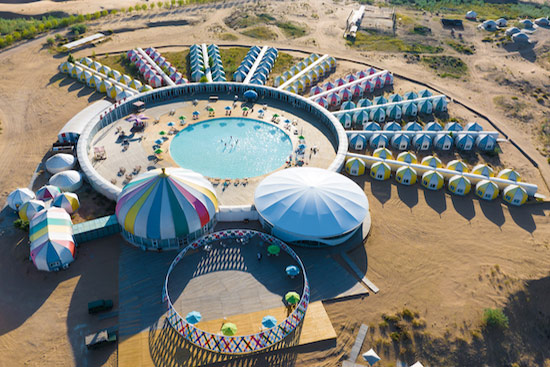 一粒沙度假村與沙漠各島隔河相望,于罕臺河東岸半山腰,河水從它的門前流過,對岸是茫茫沙海,在這里體驗水上瑜伽,水中健身操或參加游泳比賽。